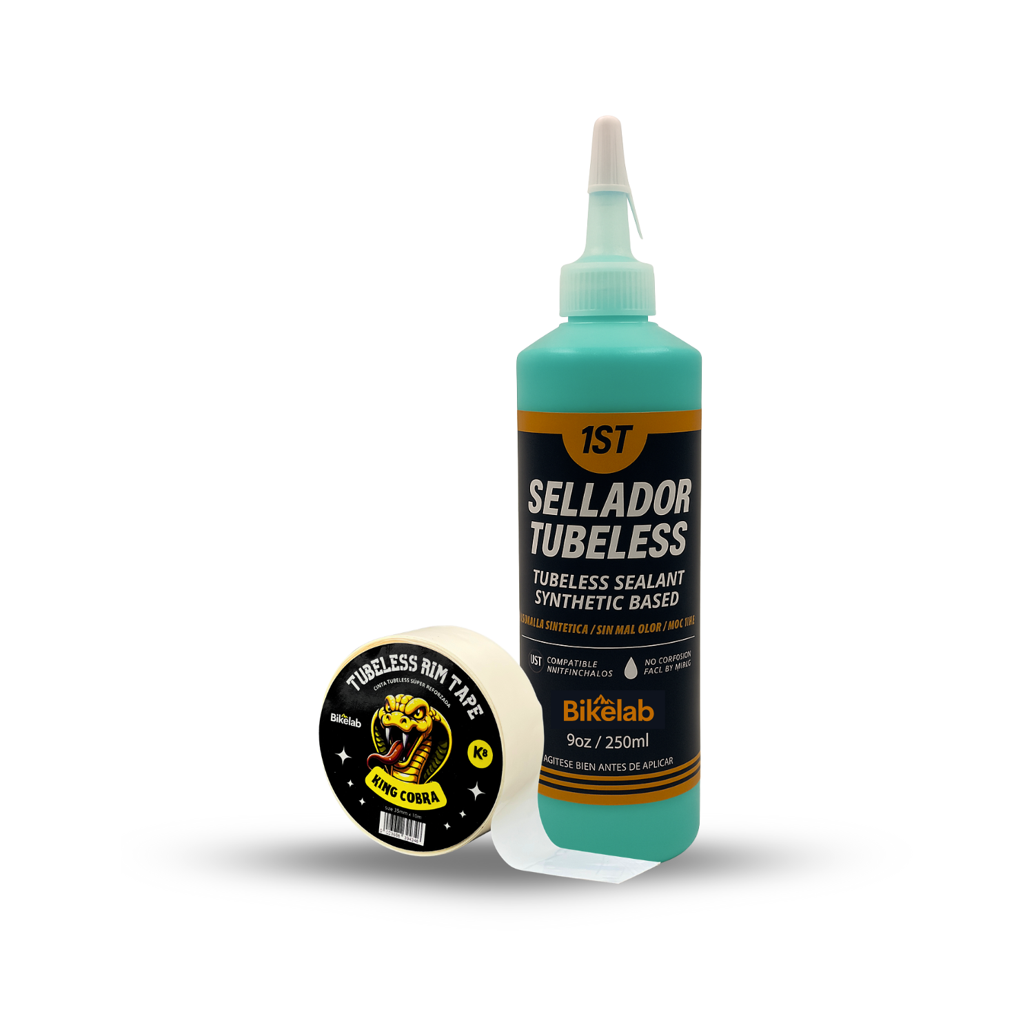 Kit Tubeless Bikelab — Incluye Sellador 250 ml con fórmula de látex natural y Cinta Resistente 35 mm de alta adherencia. Sella pinchaduras de hasta 8 mm y garantiza un sellado hermético profesional. Ideal para MTB, ruta, gravel y e-bikes. ????????????