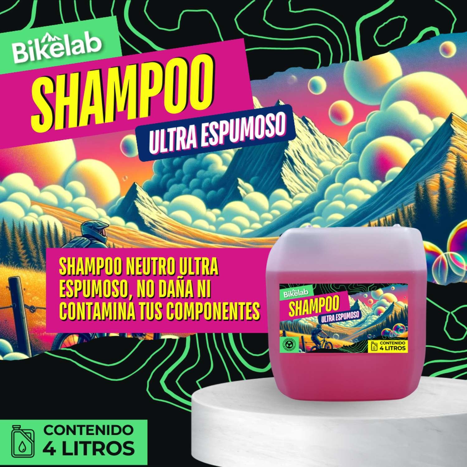 El shampoo para bicicleta Bikelab está diseñado para limpiar a fondo sin dañar las superficies delicadas de tu bicicleta.